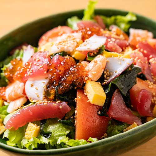 海鮮丼はネタ8種でご飯の大盛無料、大椀の味噌汁にポテサラも付いてます。