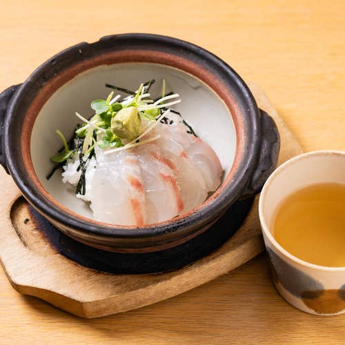 甘だれと生卵でいただく鯛の刺身ランチ。